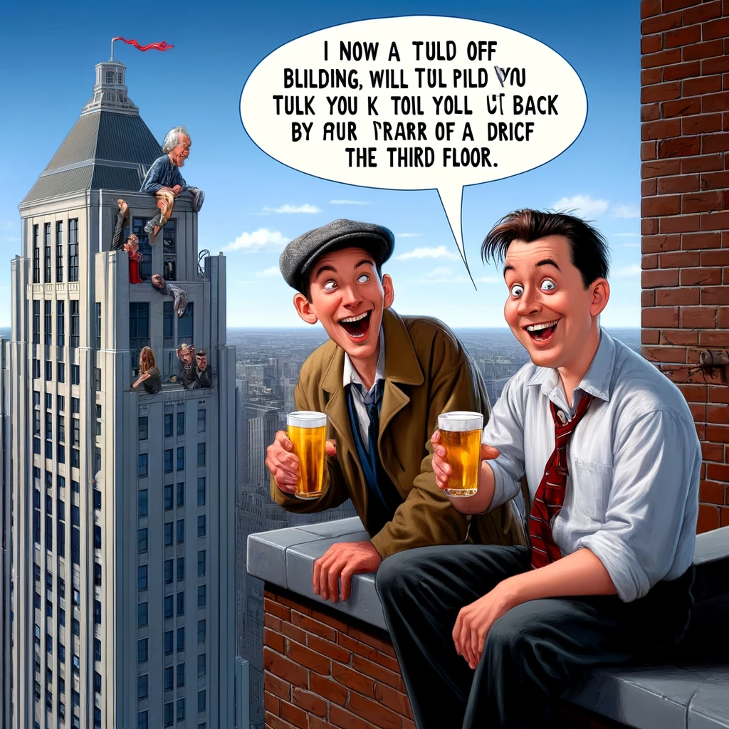 Tom and Clark are standing on the roof of their building drinking a few beers on their break when Clark says, “Hey Tom, did you know that if you jump off this building, after you get down so far, a draft will pull you back inside the building on the third floor?”