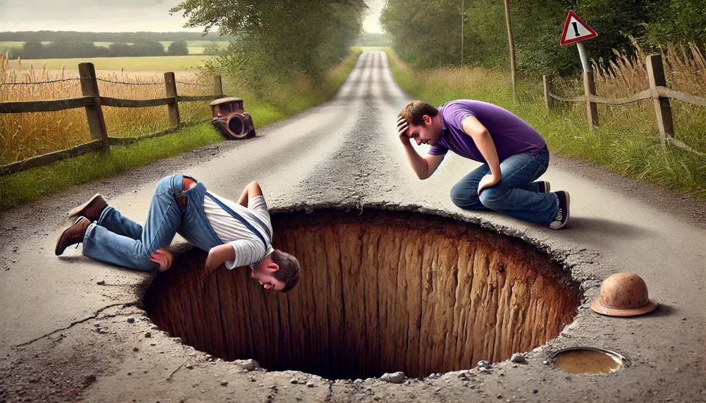 Two guys are walking down a road when they come across a deep hole beside it
